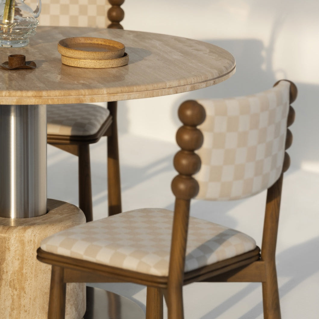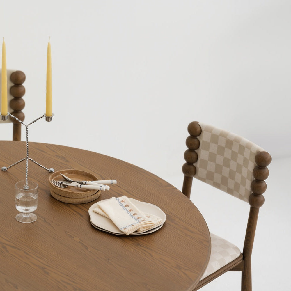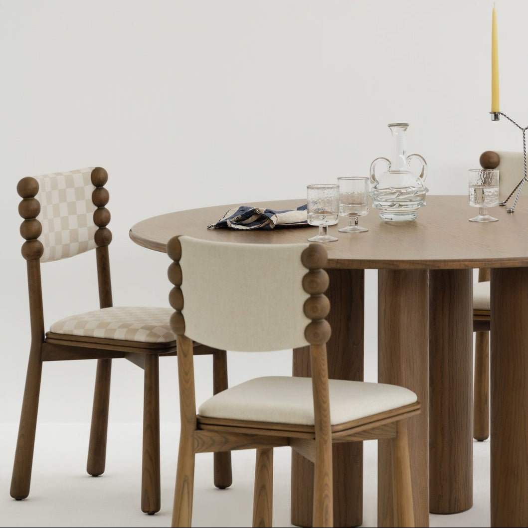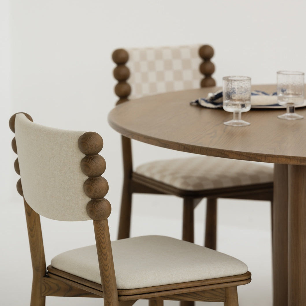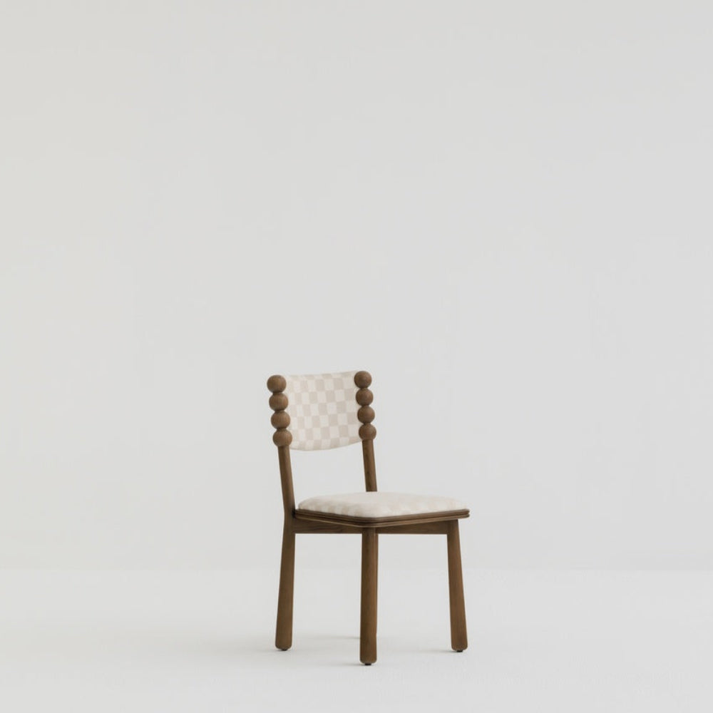A soft beige check that adds quiet character without noise. This chair pairs its patterned fabric with a smoked ashwood frame in a deep charcoal stain, bringing clarity to the silhouette.