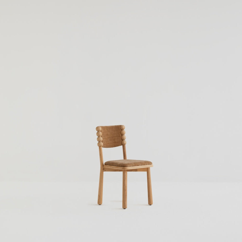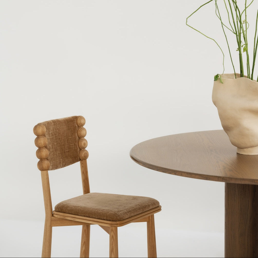 A rich, brown, velvet-like fabric that deepens the chair’s warmth. This chair balances its natural ash wood frame with a plush, light-catching surface.