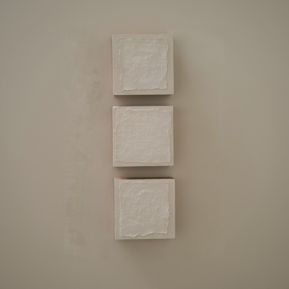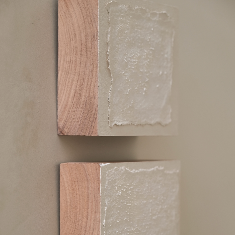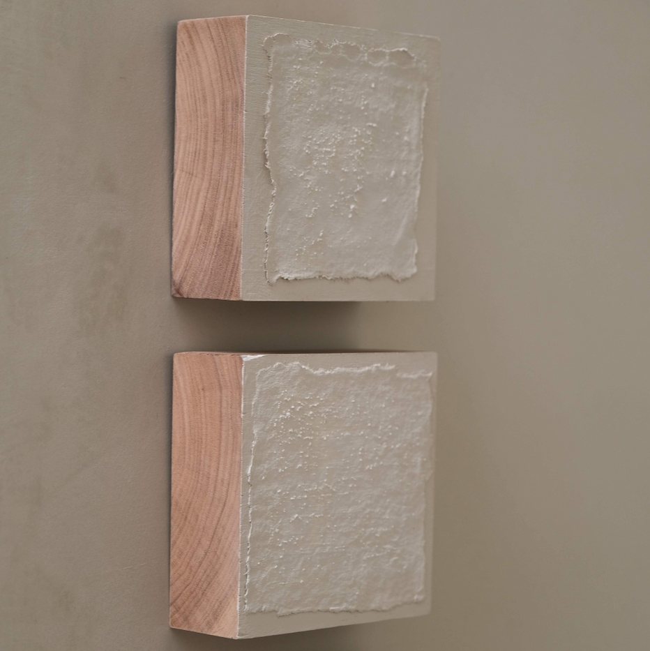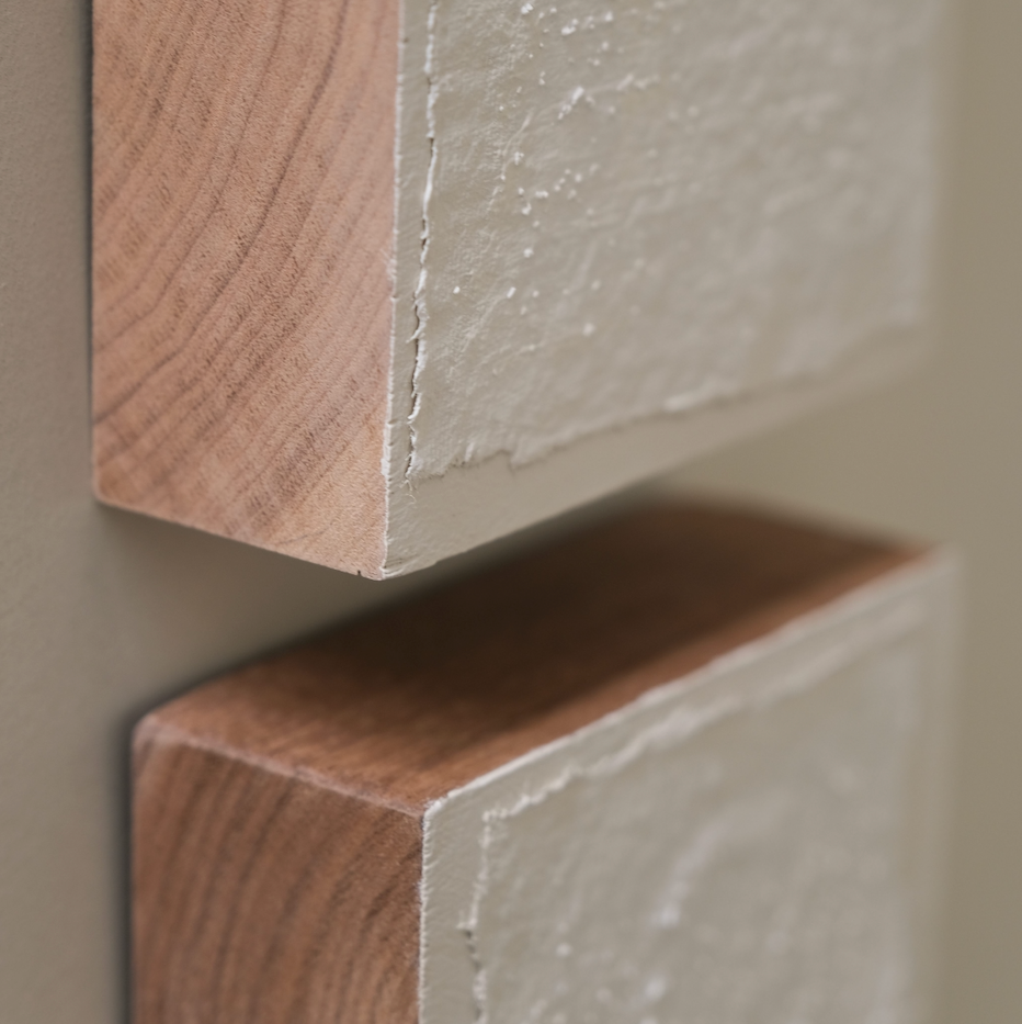 The solid oak represents foundation, grounding, and permanence - a material that holds the memory of the earth. The textured cotton paper layered on top softens that strength, bringing lightness, sensitivity, and imperfection into balance.